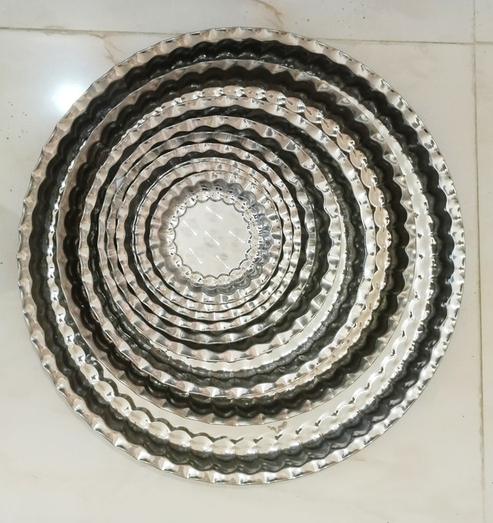 سینی های استیل برای سرو غذا میوه به عنوان سینی مزه و پذیرایی جنس ضخیم دور کنگره در نه سایز مختلف